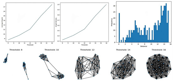 Experimentation of graph creation regarding different threshold values for Euclidian distance matrix randomly selected from P4 train set. Subfigures show the effect of changing the threshold on average degree, graph density, and graph structure. The figure includes the frequency distribution of the graph with respect to Euclidian distance values, providing a breakdown of the count of distance values that fall between certain intervals.