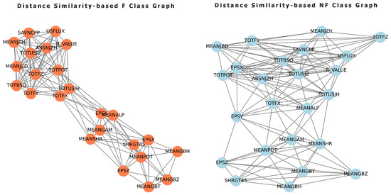 A view of the structure of randomly selected opposite-class distance similarity-based graphs created from thresholded Euclidian distance matrices, which illustrate the inter-parameter connections. The nodes have a one-to-one correspondence with the magnetic field parameters from Table 1. The F graph represents an X1.8 flare observed in NOAA active region 4920, spanning 19 December 2014 at 03:12 UTC to 19 December 2014 at 15:00 UTC. The NF graph corresponds to an FQ event in NOAA active region 4618, with a timestamp from 28 September 2014 at 00:48 UTC to 28 September 2014 at 12:36 UTC.