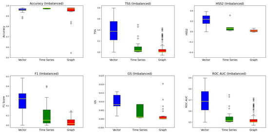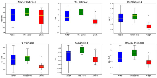 Demonstration of accuracy, TSS, HSS2, F1, GS, and ROC AUC performance results of vector (blue), time series (green), and graph (red) data representation methods in boxplot format under optimized preprocessing setting. For each method, the classification results of all submethods are aggregated to illustrate the overall performance of the group.