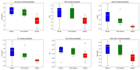 Demonstration of accuracy, TSS, HSS2, F1, GS, and ROC AUC performance results of vector (blue), time series (green), and graph (red) data representation methods in boxplot format under undersampling setting. For each method, the classification results of all submethods are aggregated to illustrate the overall performance of the group.