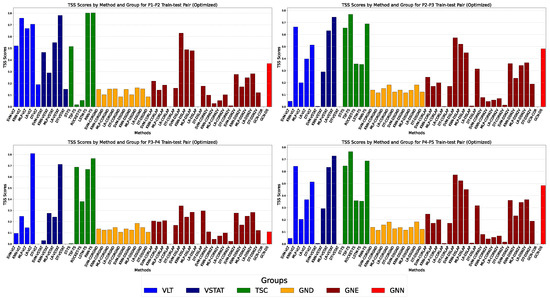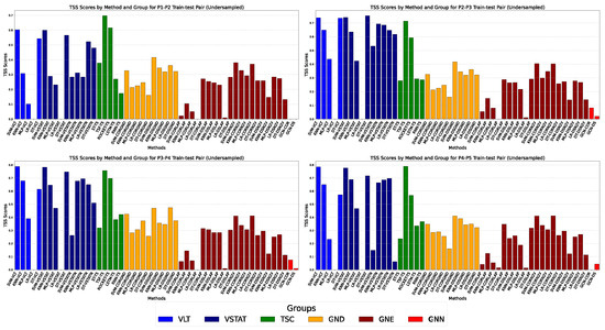 We compare the TSS performances of each model in each train–test partition pair, and Figure 20 displays the results. Regarding the top performers (Table 5), for the train–test pair of P1–P2, the top five TSS results are achieved by RNN-TS, LSTM-TS, LR-VSTAT, KNN-VLT, and LR-VLT, with TSS values of 0.8036, 0.8015, 0.7819, 0.7585, and 0.7061, respectively. For the train–test pair of P2–P3, the top five TSS results are achieved by TSF-TS, LR-VSTAT, RNN-TS, KNN-VLT, and ST-TS with TSS values of 0.768, 0.7445, 0.6899, 0.6628, and 0.6551, respectively. For the train–test pair of P3–P4, the top five TSS results are achieved by LR-VLT, RNN-TS, LR-VSTAT, TSF-TS, and LSTM-TS with TSS values of 0.8094, 0.7648, 0.7117, 0.6875, and 0.6671, respectively. For the train–test pair of P4–P5, the top five TSS results are achieved by TSF-TS, LR-VSTAT, RNN-TS, ST-TS, and KNN-VLT with TSS values of 0.7645, 0.7278, 0.6873, 0.6464, and 0.6434, respectively.