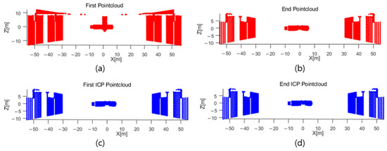 By applying the PCA method to the point cloud obtained through ICP matching, the attitude transformation matrix of the point cloud is calculated, and the initial attitude transformation matrix of the point cloud data can be obtained by converting it to the frame of the LiDAR sensor. The equations for the process of matching point clouds through the ICP method and converting them into frames of the LiDAR sensor are shown in Equations (14) and (15).
