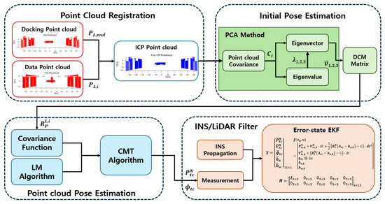 After that, the rotation matrix between consecutive frames was calculated through the CMT algorithm [17], and a continuous high-precision pose estimation algorithm was designed through the error-state EKF based on the INS model. Unlike previous studies that estimate position and velocity using orbital equations and estimate attitude using angular velocity, this paper used the INS propagation model based on IMU data. And we proposed an INS/LiDAR combined filter that uses position and attitude calculated through the point cloud algorithm as a measurement. The performance of the algorithm designed through a simulation and experiment was compared and analyzed with the existing methods.