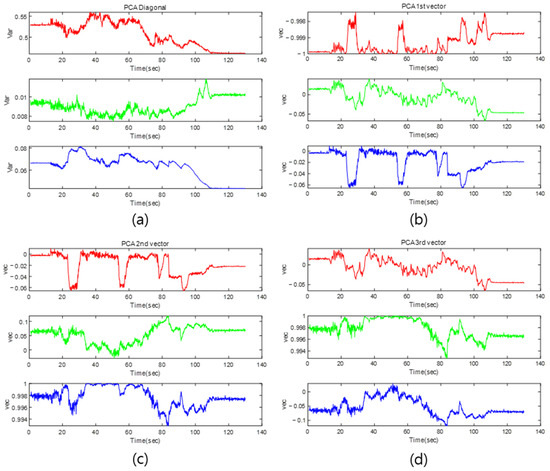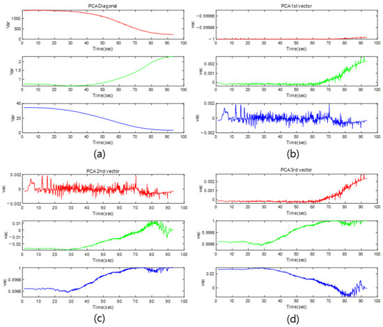 Variance and eigenvector variation result of PCA in simulation: (a) variance change in point cloud; (b) first eigenvector direction change; (c) second eigenvector direction change; (d) third eigenvector direction change.