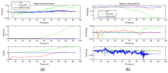 Like the simulation, the point cloud obtained from the experiment shows very small changes in variance and eigenvectors in Figure 11. This shows that the E2PCA method can be applied to obtain a stable initial rotation matrix even if the density and distribution of the point cloud data change frequently. Similarly to the simulation, error-state EKF was applied to compare the position and attitude error estimation results for each algorithm. For each method, we performed propagation using the INS model and then combined the EKF filter using the measurements obtained by each algorithm.