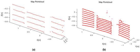 The left side of Figure 8 shows the close docking scenario of the target and chaser in the indoor experiment. The target is a simple satellite with dimensions 200 cm in width and 80 cm in height, while the chaser, a UGV(WeGo), is equipped with sensors and a mission computer called NUC(Intel), and the target and chaser are positioned 6 m apart. The UGV slowly approached the target with very slow, straight-line driving, IMU was stored in the NUC at 100 Hz, and point cloud data were stored at 10 Hz through Ouster LiDAR. An optical precision positioning device called Optitrack was used as the reference device, and both sensor data and reference data were stored through ROS 20.04 on the NUC. Table 3 shows the specifications of the LiDAR sensor used in the actual experiment.