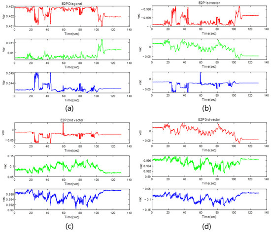 Variance and eigenvector variation result of E2PCA in experiment: (a) variance change in point cloud; (b) first eigenvector direction change; (c) second eigenvector direction change; (d) third eigenvector direction change.