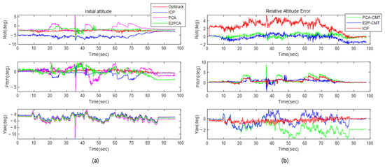 Estimation result in experiment: (a) initial attitude error; (b) relative attitude error.