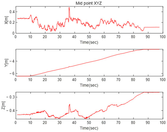 The experimental results also show that the E2PCA-CMT method has the best overall estimation results for position and attitude estimation. In the case of the ICP algorithm, similar to the simulation, it can be seen that the error is large in the initial section that is not properly matched, and then the estimation becomes stable. In the case of E2PCA-CMT, the roll and pitch attitude estimation show a significant reduction in error compared to the other two methods. However, in the case of position, we can see that the estimation error is relatively large compared to the simulation. As shown in Figure 14, the scale of the target is reduced in the actual experimental environment, unlike the simulation, and the vertical axis resolution of the LiDAR causes an error in position estimation based on the center point of the point cloud, which is characteristic of the CMT algorithm.