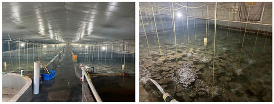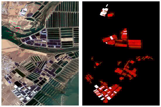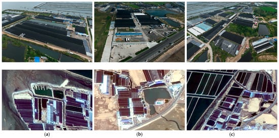 As shown in Figure 1, factory aquaculture is a type of high-density intensive-farming production mode that combines modern industrial and biological technologies in closed and semiclosed water bodies []. The development of the factory aquaculture industry not only provides huge economic benefits but also poses several ecological and environmental challenges. For example, the disordered discharge of aquaculture tailwater pollutes the water quality of offshore seawater and frequently causes marine natural disasters, such as red and green tides []; in addition, it damages the sandy shoreline near the culture area, resulting in natural habitat loss, ecosystem degradation, and other problems [,]. Therefore, strengthening factory aquaculture area monitoring is critical to ensure the orderly development of the coastal factory aquaculture industry.