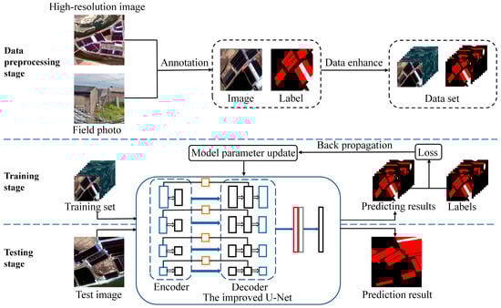Recently, the theory and application of deep learning has made rapid progress. Some researchers have employed deep learning semantic segmentation technologies for building recognition in high-resolution remote-sensing images. For example, Long et al. improved the U-Net network structure using a multiscale atrous-convolution module and realized the segmentation of pixel-level urban buildings in high-resolution remote-sensing images []. He et al. proposed an E-Unet deep learning network based on atrous convolution to improve extraction accuracy for buildings []. These studies provide ideas for the remote-sensing information extraction of factory aquaculture plants.