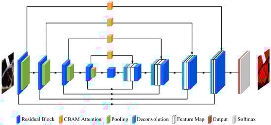 The proposed MRAN model was based on the U-Net model [], incorporating a residual structure, an attention module, and a multiscale connection; the network structure is shown in Figure 6. First, a common convolutional block of U-Net was replaced with a residual block to enhance feature extraction ability and network stability, which improves segmentation accuracy. Second, in the encoding stage, the results of the convolution of residual blocks were sent into the attention module to learn the importance of different channels and spatial positions, adjust the weight values of various information adaptively, and enhance useful information while suppressing irrelevant information and improving segmentation accuracy. Finally, via a multiscale connection, the shallow-level features of the encoding stage, deep-level features of the decoding stage, and results of the convolutional attention calculation were cascaded to integrate the features of different levels and improve the learning ability of the model for multiscale objects.