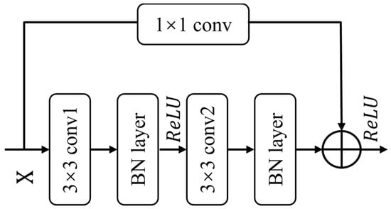 Herein, every two common convolutional layers in the U-Net model were replaced by one residual block, and a total of nine residual blocks were obtained. Consequently, the encoder and decoder stages have five and four residual blocks, respectively. A schematic of a residual block is shown in Figure 7. Each residual block contained two convolution layers, and after each convolution layer, there was a batch normalization layer and a ReLU activation function. Because the number of channels in the input feature graph changed after two convolution layers, a 1 × 1 convolution was employed to adjust the number of channels in the input feature graph, enabling identity mapping and allowing it to quickly connect with the feature graph after the two convolution layers.