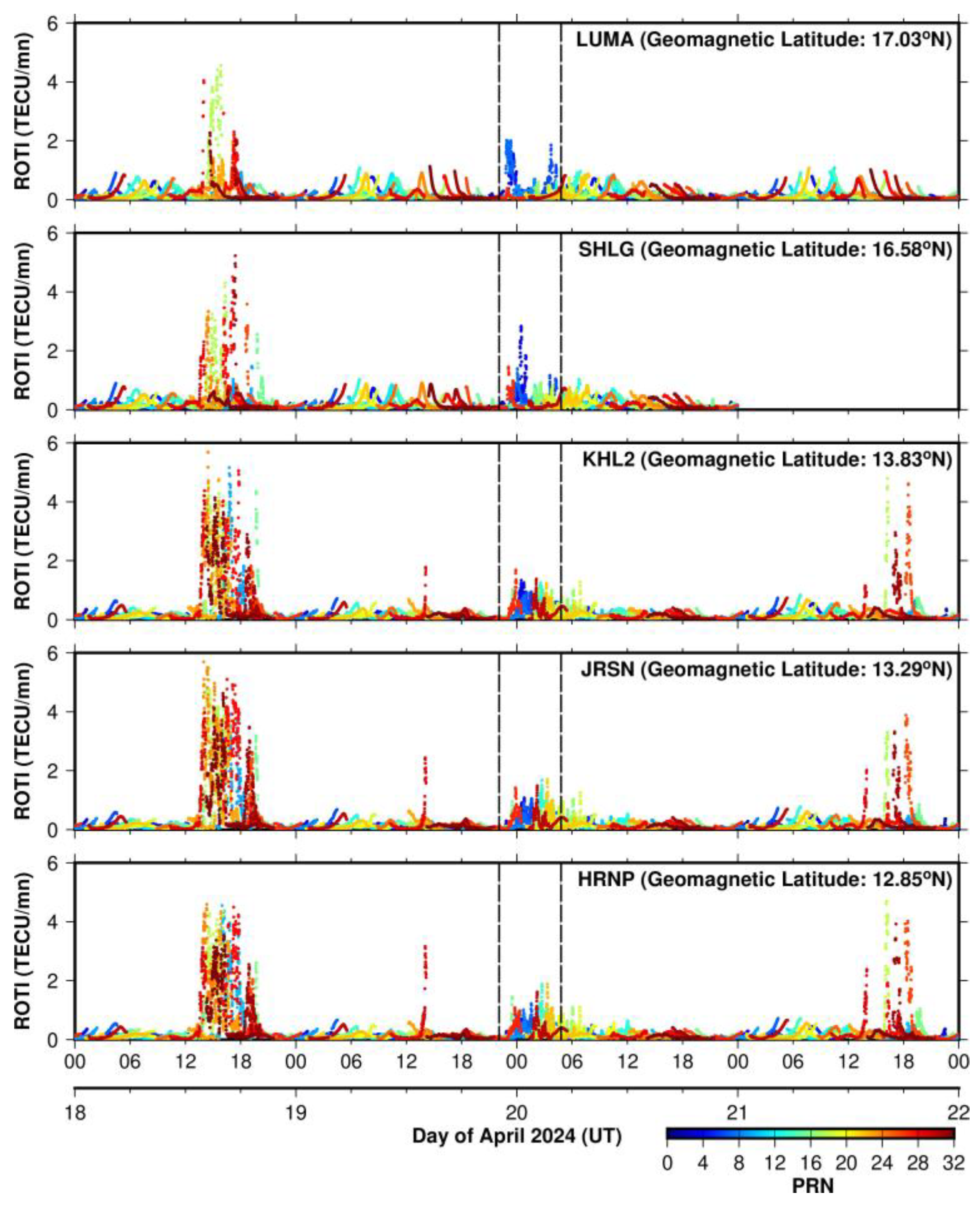 3.2.2. ROTI from 70–80°E Longitude Sector During 18–21 April 2024