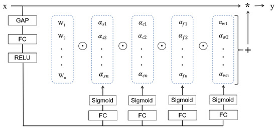 where awi represents the attention scalar of the convolution kernel wi, and asi∈Rk × k, aci∈Rcin, and afi∈Rcout represent three newly introduced attention modules along the spatial dimension, input channel dimension, and output channel dimension, respectively. These four attention modules were calculated using the multi-head attention module Πi (x). In the graph, the symbol "*" represents the convolution operation. Convolution operation is a basic operation in convolutional neural networks, which is used to extract and transform the input data. A new feature map is generated by multiplying and summing the convolution kernel element-by-element with the input feature map to capture spatial and channel dependencies in the data.