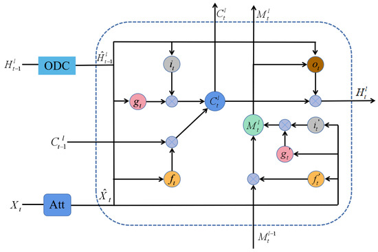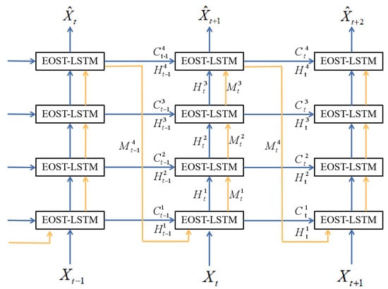 Based on the previous stack structure, the model proposed in this paper adds an efficient multi-scale attention module and a full-dimensional dynamic convolutional module. The specific structure is shown in Figure 6. To build this network structure, we used a stack of four layers of EOST-LSTM cells. In this structure, the spatial storage unit M transmits updates between layers through a zigzag path, symbolizing the flow of information in the spatial dimension of the network. This path is represented by an orange line. At the same time, the time storage unit C is updated in the same layer along the horizontal direction, representing the continuity in the time dimension, shown by a blue line.