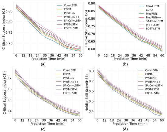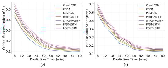 In this experiment, we used the Critical Success Index (CSI) and Heidke Skill Score (HSS) as measures to assess the model’s ability to predict future situations based on historical radar data. Specifically, we first converted the radar data into a binary format, and then statistically predicted the correct cases (true positive, TP) and the wrong cases (false positive, FP; true negative, TN; and false negative, FN) according to different thresholds (10 dBZ, 20 dBZ, and 35 dBZ). These statistics help us to comprehensively consider the detection probability and false alarm rate of the model, so as to quantify the accuracy of the prediction. The higher the values of CSI and HSS, the more accurate the prediction result and the stronger the performance of the model.