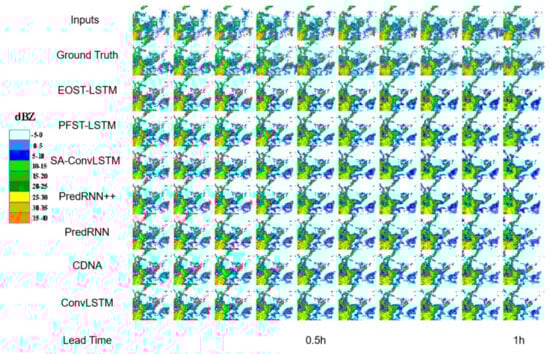 In order to more intuitively show the performance of different models in radar echo prediction tasks, this paper shows prediction examples of each model in Figure 9. Most of the models were close to the actual observations at the start of the 60 min prediction period, but as time went on, the accuracy of other models, such as ConvLSTM, PredRNN, and its improved version PreDRNN++, began to decline, especially when dealing with strong echo regions. The predictions of these models gradually become blurred and eventually lose some of their details. In contrast, EOST-LSTM and PFST-LSTM can preserve the characteristics of strong echo regions effectively to a certain extent, where EOST-LSTM performs better in terms of position accuracy. This is due to the EOST-LSTM’s combination of attention mechanisms and full-dimensional dynamic convolution module, which allows it to capture more comprehensive spatio-temporal information, effectively simulating long-term dependencies in the data, and thus preserving more detail when predicting radar echoes, reducing positional bias, and improving overall prediction accuracy. These results show that the prediction results of EOST-LSTM are richer in detail, and the prediction error caused by information loss is avoided.