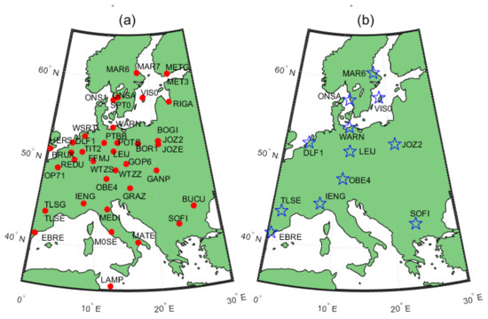 Distribution of the selected GNSS monitoring stations (41 red stations (a), 12 blue stations (b)).