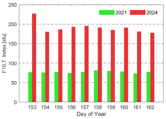 When selecting the ionospheric modeling time, we considered different solar and geomagnetic activity during solar cycle 25. Figure 2 shows the solar radio flux at 10.7 cm wavelength (download link: https://wdc.kugi.kyoto-u.ac.jp/kp/index.html#LIST (accessed on 8 February 2025)) during the two periods. The day of year (DoY) 153–162 in 2021 corresponds to the quiet period with the F10.7 index between 73.3 and 80.8 sfu (solar flux units), while in 2024, its F10.7 index varies from 177.8 to 226.9 sfu. This indicates that the solar activity in 2024 is particularly active. On the other hand, the geomagnetic Kp index (download link: https://wdc.kugi.kyoto-u.ac.jp/wdc/Sec3.html (accessed on 8 February 2025)) during the same period is shown in Figure 3. Most Kp index values in 2021 can be kept within 1–2 and no more than 3.67, indicating calm geomagnetic activity. In contrast, the Kp index in 2024 is higher, with several peaks exceeding 5, reflecting the active state of the ionosphere during this period.