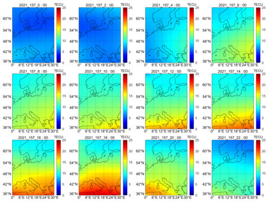 Regional ionospheric VTEC maps based on the IW SFPPP-derived STECs on DoY 157, 2021.