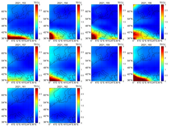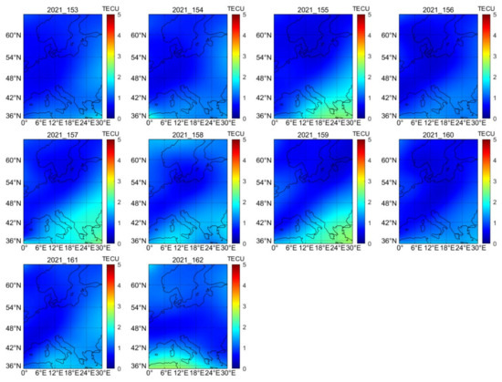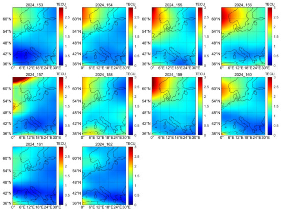 RMS maps of VTEC differences between the IW SFPPP method and final GIM products on DoY 153–162 in 2021.