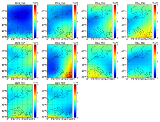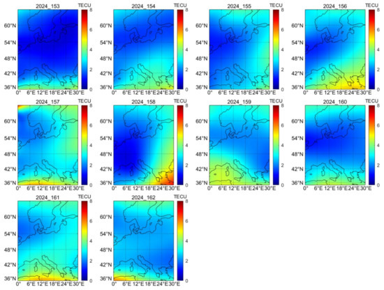 The same comparative strategies are applied to the high-solar-activity year of 2024. The corresponding RMS maps of dVTEC generated by the IW SFPPP and CCL methods are presented in Figure 11 and Figure 12, respectively. The variation amplitude of the daily dVTEC solutions in 2024 is more intense than that in 2021, with peak values of up to 8 TECU, which is reasonable given that ionospheric VTEC is more difficult to model under high solar and geomagnetic conditions. The majority of dVTEC values of the IW SFPPP method are significantly lower than those of the CCL method on DoY 155–156 and 159–160. More than half of dVTEC for the IW SFPPP can be less than 3 TECU in daily solutions, while for the CCL method, the corresponding dVTEC values are kept within 3 to 5 TECU. This proves that the IW SFPPP method still outperforms the CCL method in high-solar-activity years.