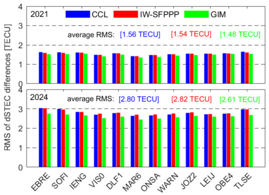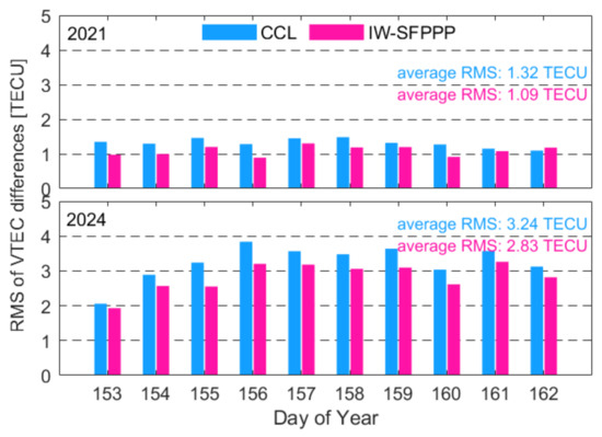 RMS of VTEC differences between the IW SFPPP method and CCL method.