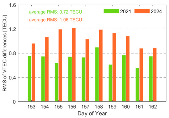 Figure 8 summarizes the RMS of ionospheric VTEC values derived from the IW SFPPP method. The error bars in this figure represent the STD of ionospheric VTEC values. The ionospheric VTEC values in 2024 with about 30 TECU are much larger than those in 2021 with about 12 TECU, which is consistent with the trend of the F10.7 index during the same period (seen in Figure 2). From the results of the error bars, it can be seen that the mean STD of ionospheric VTEC in 2024 can reach 8 TECU, while in 2021, the corresponding statistical value is around 3.7 TECU. This proves that the ionospheric VTEC in 2024 have greater variation amplitude in daily solutions.