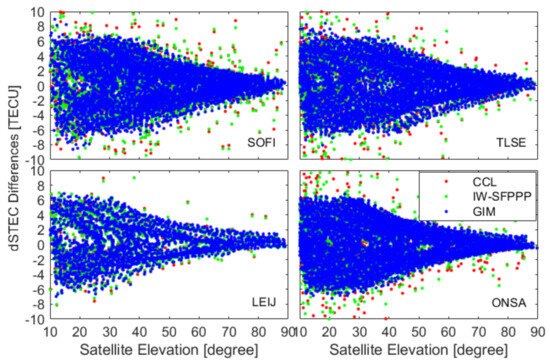 Considering that the epoch-differenced GF combinations of carrier-phase observations have the ability to obtain the mm level STEC variations (i.e., dSTEC), the dSTEC can be adopted as the referenced values to verify the external accord accuracy of different ionospheric VTEC models [39]. The dSTEC modeled values corresponding to the above dSTEC referenced values are calculated from different regional ionospheric VTEC models (IW SFPPP and CCL methods) and CODE final GIM products. Thus, the dSTEC differences can be defined as the dSTEC modeled values minus the dSTEC reference values. In this section, twelve well-distributed stations marked in blue, as shown in Figure 1b, are used to implement the dSTEC comparison. The sampling rate of dSTEC is set to 5 min. Figure 17 and Figure 18 show the dSTEC differences in four representative stations on DoY 157 in 2021 and 2024, respectively. It can be seen that dSTEC differences in 2024 are significantly larger than those in 2021 for both regional and global ionospheric VTEC models, which is caused by the larger ionospheric delays and drastic changes during high-solar-activity years. As the satellite elevation increases, the dSTEC differences sharply decrease. When the satellite elevation is higher than 40 degrees, the dSTEC differences in 2021 can be maintained within 4 TECU, but in 2024, the corresponding value is increased to 6 TECU. On the other hand, the distribution of dSTEC differences for both IW SFPPP and CCL methods is not as concentrated as for GIM products. This indicates that the quality of the final GIM products is slightly better than that of the regional ionospheric VTEC models established in this contribution.