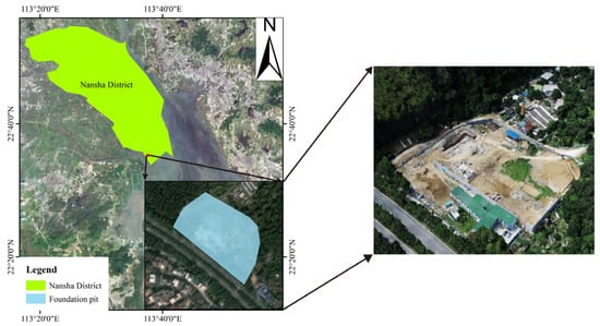 This study focuses on the 220 kV Port Substation foundation pit project in Nansha District, Guangzhou, located at approximately 113°34′33″E and 22°46′14″N (Figure 1). The foundation pit is part of the region’s power infrastructure, influenced by various geological and environmental factors, including soil composition, groundwater conditions, rainfall, and nearby human activities like subway construction and residential buildings.