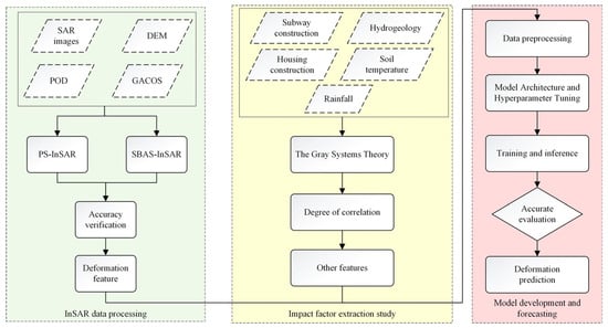 Figure 2 illustrates the comprehensive workflow followed in this study, which consists of three main stages: InSAR data processing, impact factor extraction, and model development and forecasting. Initially, SAR images, DEM data, and POD are collected and processed using SARscape 5.7, with PS-InSAR and SBAS-InSAR techniques to extract deformation features. Then, ArcGIS 10.8 is used for visualization analysis and accuracy verification to ensure reliability. In the second stage, impact factors such as subway construction, housing construction, soil temperature, and rainfall, along with hydrogeological data, are analyzed through gray correlation analysis to evaluate their association with deformation. Finally, the data undergo model development, which includes preprocessing, model architecture design, and hyperparameter tuning, followed by training, inference, and deformation prediction. A subsequent evaluation assesses the model’s accuracy and forecasting capability.
