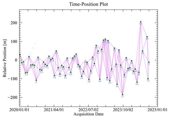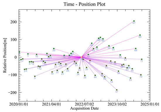 The foundation pit project commenced in May 2023 and was completed in December 2023. Using 72 ascending-track Sentinel-1A synthetic aperture radar images, combined with PS-InSAR and SBAS-InSAR techniques, vertical ground deformation monitoring results for the pit site from 2020 to 2024 were obtained. The final deformation results were primarily based on SBAS-InSAR monitoring, which is due to its ability to process multiple small baseline subsets of synthetic aperture radar images. This provides unique advantages in capturing the spatial variation in large-scale ground deformation. Such dense spatial coverage allows for a more comprehensive and detailed presentation of deformation patterns, which is crucial for understanding the complex deformation processes in the foundation pit and its surrounding regions, especially in areas with significant spatial heterogeneity. The ground deformation time-series was analyzed as follows.