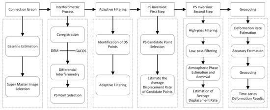 The acquired images are first subjected to differential interferometric processing and registered to the master image from 21 May 2022 (Figure 3). Then, adaptive filtering is applied to identify the DS points from the interferogram. High amplitude pixels are selected as candidate PS points using the amplitude deviation index. Subsequently, the linear deformation rate and elevation errors are inverted based on the linear deformation model. The residual errors are then decomposed to obtain nonlinear deformation information, ultimately providing surface deformation data. The specific process is shown in Figure 4.