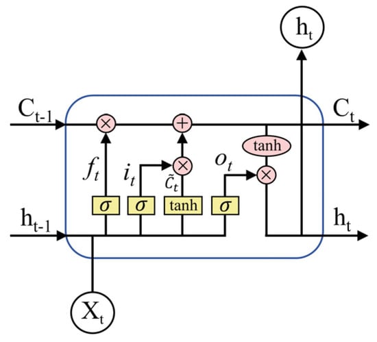 LSTM (Long Short-Term Memory) improves upon traditional RNNs by effectively addressing the issues of gradient explosion and vanishing gradients, making it particularly successful in the field of time-series prediction [31,32]. As shown in Figure 7, LSTM introduces three gating mechanisms—forget gate, input gate, and output gate—along with a memory cell to regulate the flow of information. These mechanisms enable LSTM to selectively retain or discard information, enhancing the model’s ability to process and learn from long-sequence data. This architecture empowers LSTM to capture both short-term and long-term dependencies, making it a robust tool for sequential data modeling [33].