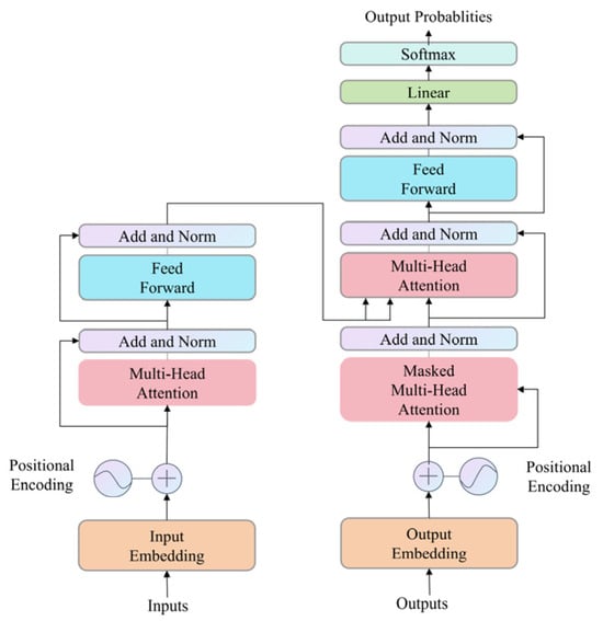 The Transformer is an encoder–decoder architecture, with both the encoder and decoder consisting of multiple stacked Transformer blocks [36,37,38]. At the heart of the Transformer module lies the multi-head attention mechanism, which is composed of multiple independent and parallel attention mechanisms. This design allows the model to focus on information from different subspaces, enabling the attention mechanism to capture the multidimensional features of input data effectively [39,40,41]. Additionally, the Transformer leverages layer normalization (LN) and skip connections to enhance training efficiency and predictive performance. These structural innovations contribute to the model’s robustness and ability to handle complex data dependencies [42,43]. The core computational formula of the Transformer model is as follows: