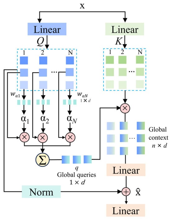 Specifically (see Figure 9), the input embedding matrix x is transformed into a query matrix Q and a key matrix K via two matrices Wq and Wk, where Q, K ∈ Rn×d and Wq, Wk ∈ Rd×d, n is the labeling length and d is the dimension of the embedding vector. Then, the query matrix Q is multiplied by the learnable parameter vector Wa ∈ Rd to learn the attention weight of the query, generating the global attention query vector α ∈ Rn, computed as follows: