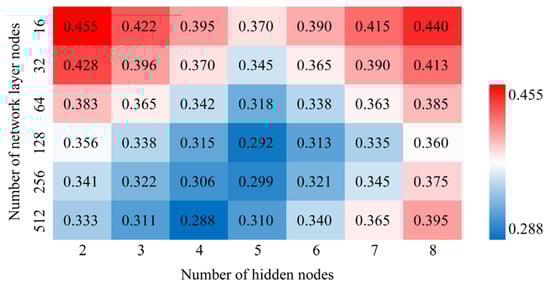 The grid search method exhaustively evaluates all possible parameter combinations to find the optimal configuration for improving model prediction accuracy [50]. In this study, grid search was applied to optimize the number of network layers (K) and the number of hidden layer nodes (S). Figure 14 presents the prediction heatmap, illustrating the distribution of model prediction errors under different combinations of network layers and hidden layer nodes. The color intensity in the heatmap represents the magnitude of prediction errors. The analysis revealed that the number of layers and hidden nodes were not the only factors influencing prediction accuracy. For a configuration of five network layers and 128 hidden layer nodes, the model achieved a good balance between capturing complex features in the data and avoiding overfitting. Fewer layers might fail to fully capture deep-level information, while excessive layers could lead to overfitting, diminishing the model’s generalization ability. Therefore, the optimal configuration for the model in this study was determined to be five layers with 128 hidden nodes.