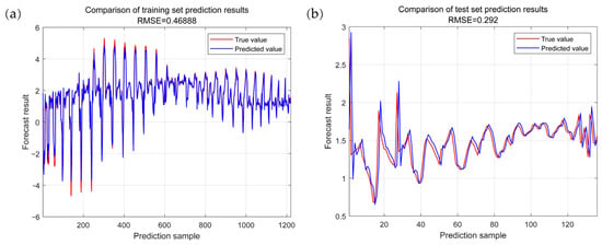 Comparison of model prediction results with those of SBAS-InSAR method. (a) Training set training results. (b) Test set prediction results.