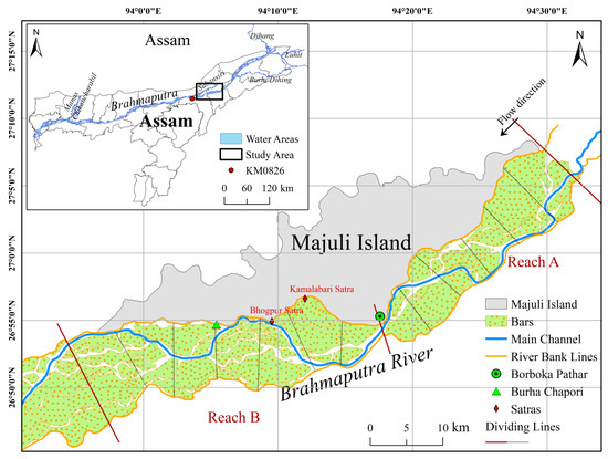 Branches and bars in braided rivers are always in the process of formation and elimination [8,18,28], and the scouring of the riparian zones by the water flow in unstable channels is a serious problem that affects the safety of the people living around them [22,23,29,30]. It is, therefore, necessary to develop appropriate precautionary measures by studying the pattern of morphological changes in braided rivers. In the Brahmaputra River, the river reach flowing through the Vale of Assam is the first and typical braided reach downstream of the plateau. This reach experiences floods and channel deformation every year due to concentrated monsoon rains or the snow and ice melt from the Himalayas [31,32,33]. Floods, planform evolution, and bank erosion have threatened the productive lives of the local inhabitants and economic development [22,23,29,30]. For instance, Majuli Island, the largest inhabited river island in the world with a population of 160,000, is experiencing serious land loss. More than half of the island’s ancient religious buildings named Satra, the center of Indian neo-Vaishnavite culture, were reported to be destroyed due to severe erosion [17,34]. The main reason is that the braided Majuli Island reach of the Brahmaputra River (Majuli Reach) undergoes significant changes in bankline (defined as the active channel boundary demarcating perennial flow areas that persist after the monsoon) and redistribution of bars, channels, and braiding degree [1,3,35].