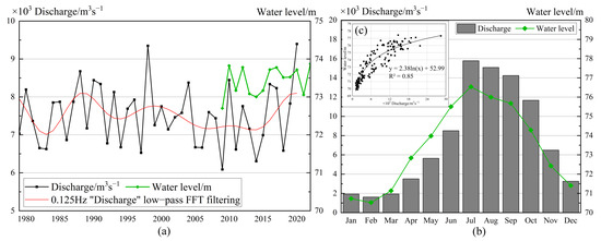 Characteristics of the hydrological factors in Majuli Reach. (a) Long-term changes in discharge (1979–2020) and water level (2009–2022). The discharge time series was signaled using a low-pass FFT filter to make the long-term trend in discharge more apparent. (b) Monthly trends in discharge and water level. (c) Stage–discharge curve constructed from monthly discharge and water level data for the years 2009–2020.