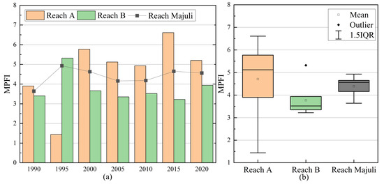 Braiding index MPFI (Modified Plan Form Index) of the Majuli Reach and its sub-reaches (Reach A and Reach B) during the past three decades (1990–2020). (a) The variation of MPFI indicates a high degree of braiding of the reach. (b) The box plot shows the variability of MPFI in Majuli Reach and its sub-reaches. Reach A has a lower average but a wider fluctuation in braiding degree than Reach B. Reach A and Reach B are shown in Figure 1.