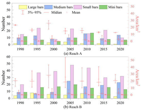 Variations in the number (shown by the bar) and area (shown by the box) of four categorized bars in (a) Reach A and (b) Reach B from 1990 to 2020. Bars are categorized according to their area: >10 km2 for large bars, 1~10 km2 for medium bars, 0.1~1 km2 for small bars, and <0.1 km2 for mini-sized bars. Reach A and Reach B are shown in Figure 1.