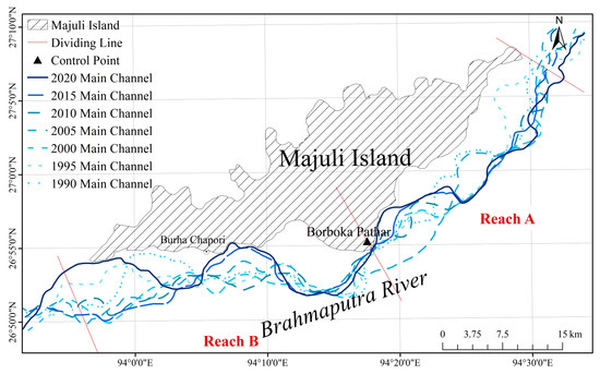 Different development trends in the main channel between Reach A and Reach B are observed (Figure 6). From 1990 to 2020, the main channel of Reach A moved south-eastwards (i.e., the left bank of the river), while the main channel of Reach B moved northward (i.e., the right bank of the river). This trend suggests that the lower reaches of the Majuli Reach are moving toward the island, while the upper reaches are moving away from the island. The lateral alterations of the main channel in the Majuli Reach are significant, particularly in Reach A, where the maximum migration distance is 9 km. Further, the main channel at the control point of BP remained virtually unchanged during the years studied. However, it is worth noting that the main channel near the control point shifted significantly in 2005, which was the year with high braiding intensity and the largest number and area of bars in the Majuli Reach. Given that the study controlled for comparable flow stages in the reach on each selected day, this high degree of braiding in the Majuli Reach in 2005, unlike other years, suggests that channel morphology is also influenced by past flow conditions.