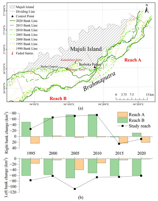 Changes in the position of banklines and the area of riparian zone: (a) bankline alterations and (b) changes in the riparian land area. By imagining the upper and lower horizontal axes in (b) as the river banklines and the two “y = 0” axes as the 1990 bankline, it can be observed that the bank area changes each year in Reach A, Reach B, and the Majuli Reach (visualized with bars and lines, see the legend) compared to the 1990 bank. A positive number on the vertical axis indicates an increase in the riparian area in that year compared to 1990, while a negative number indicates a loss of riparian land. Three of the dividing lines in Figure 1 remain for simplicity.