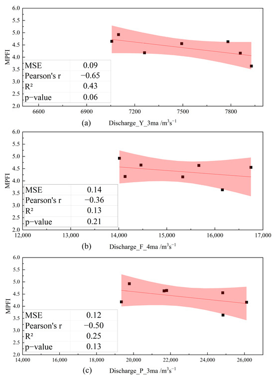 Regression analysis results of MPFI and (a) the moving average of the 3-year discharge (Discharge_Y_3ma), (b) the moving average of the 4-year flood season discharge (Discharge_F_4ma), and (c) the moving average of the 3-year flood season peak discharge (Discharge_P_3ma) are shown in the regression line graphs. (Y: hydrological year; F: flood season; P: peak value; ma: moving average).