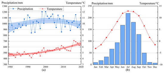(a) Long-term changes in precipitation and temperature during 1979–2020. The shaded area around the line plot represents the 95% confidence intervals after polynomial fitting. The goodness of fit was high for both temperature (sig. < 0.01) and precipitation (sig. = 0.06) data. (b) Annual trends in precipitation and temperature in the Majuli Reach.