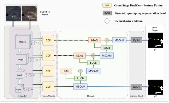 - A CDF (Cross-Stage DualConv Feature Fusion) module was designed to improve the processing and integration of dual-temporal information in the late fusion stage of the Siamese network, strengthening the model’s capability to identify challenging samples;