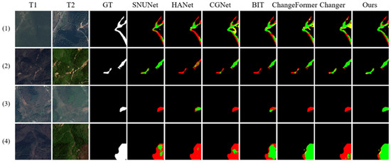 - Han, C.X.; Wu, C.; Guo, H.N.; Hu, M.Q.; Li, J.P.; Chen, H.R.X. Change Guiding Network: Incorporating Change Prior to Guide Change Detection in Remote Sensing Imagery. IEEE J. Sel. Top. Appl. Earth Obs. Remote Sens. 2023, 16, 8395–8407. [Google Scholar] [CrossRef]