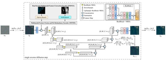 First, considering the inherent differences in imaging mechanisms and feature representations between SAR and optical images, the two data types are separately input into the dual-branch multimodal feature extraction encoder (DMFEE) for feature extraction. The extracted features are then passed into the multimodal feature fusion and de-redundancy encoder (MFFDE), which establishes complementary mapping relationships between the SAR and optical features. This enables global-scale multimodal feature fusion, effectively inferring optical information for cloud-covered regions. Additionally, the MFFDE removes redundancy in both the spatial and channel dimensions, resulting in a compact feature representation. Finally, the optimized multimodal fused features serve as conditional information and inputs into the denoising neural network (network architecture is inspired by [34]). Under the supervision of the IAP strategy, this information guides the diffusion model’s progressive generation process to reconstruct high-quality cloud-free images.